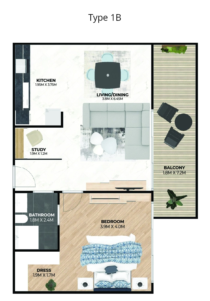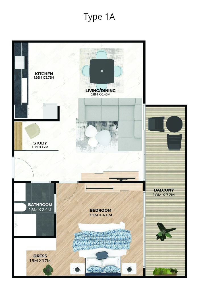 There are 72 one bedroom units, located on every floor between 2 & 7, and assigned flat numbers 01/02/03/04/05 & 08 on both towers. They are offered in 3 Types: