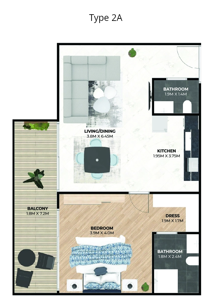 The spacious bedrooms in these units each have an attached bathroom and dressing room. The latter measuring either 1.8×2.4 m (Type 1 & 2) or 2.95×1.8 m (Type 3). Every unit comes with a generous balcony, attached to the bedroom and/or the living space.