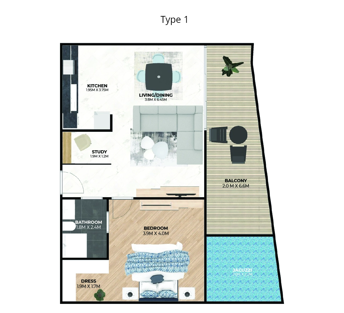 There are eight of these exclusive units, all located on the Podium’s Roof (1st Floor). They are grouped into 4 Types.