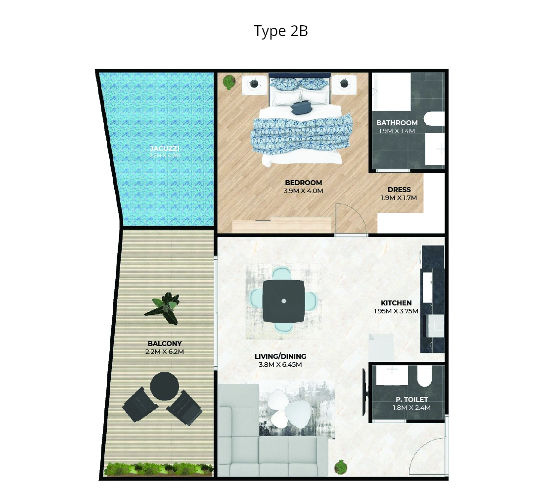 As these units are located on the Podium’s Roof, instead of a balcony, they have a front-yard-like fenced-off space, which includes a private Jacuzzi. These units also offer their residents direct access to the amenities located on the same floor – including the Koi pond, health & fitness facilities, the Green Cafe, and the infinity pool.