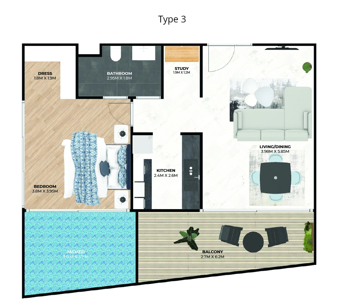 The interior of these units are identical to the corresponding standard 1B units located above them – with Types 1 & 3 offering a study/work space (1.9×1.2 m), and Type 2 offering an extra bathroom.