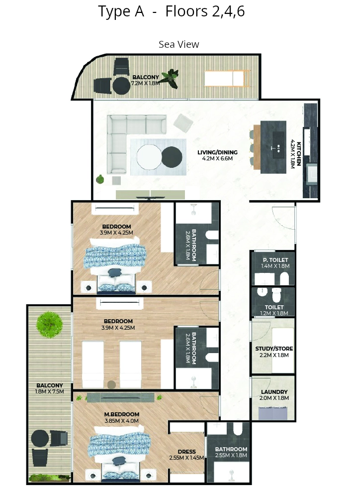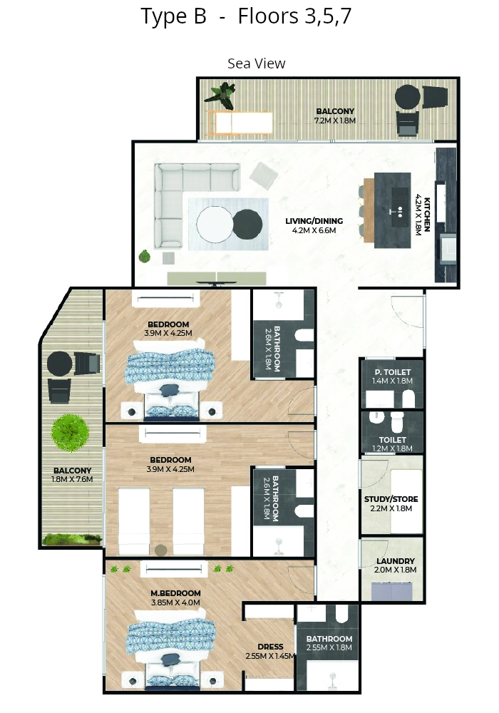 The Master Bedroom has an attached bathroom and dressing room, while the other two bedrooms have an attached bathroom. The windows and balconies of the bedrooms face either north or south.