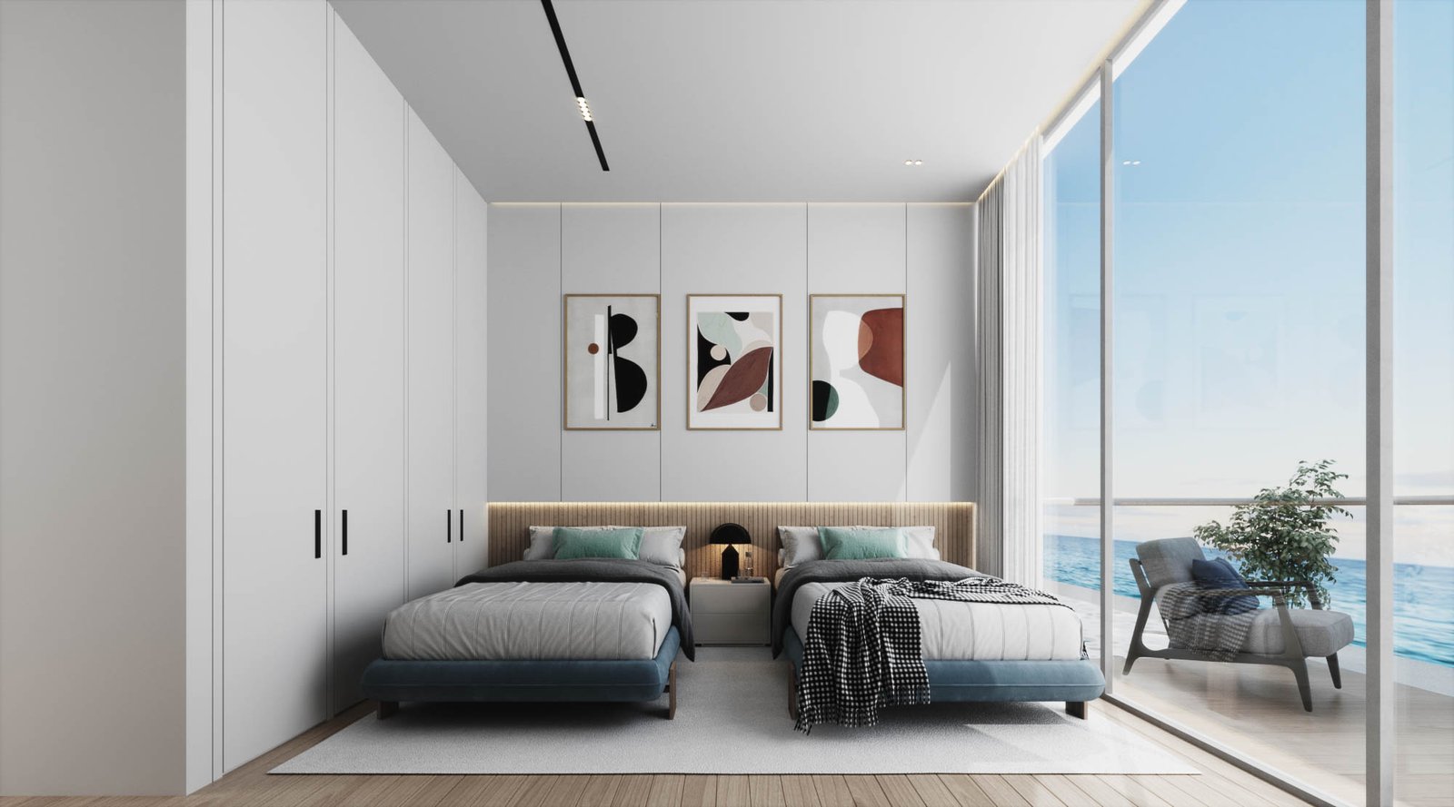Each unit also has two balconies. One is attached to the living space and offers sea views (west-facing).The other is attached to the bedrooms, facing the inner courtyard, the marina (south), the beach (west).