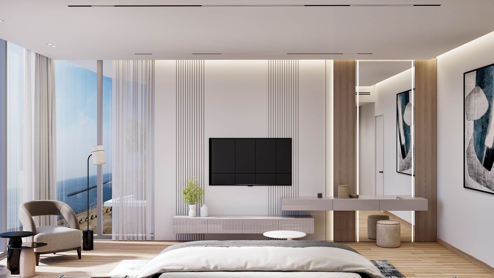 All four bedrooms have attached bathrooms and dressing rooms. The Master and 4th bedrooms have floor-to-ceiling windows, while the 2nd bedroom has access to a balcony, and the 3rd bedroom has an L-shaped balcony enveloping it on two sides.