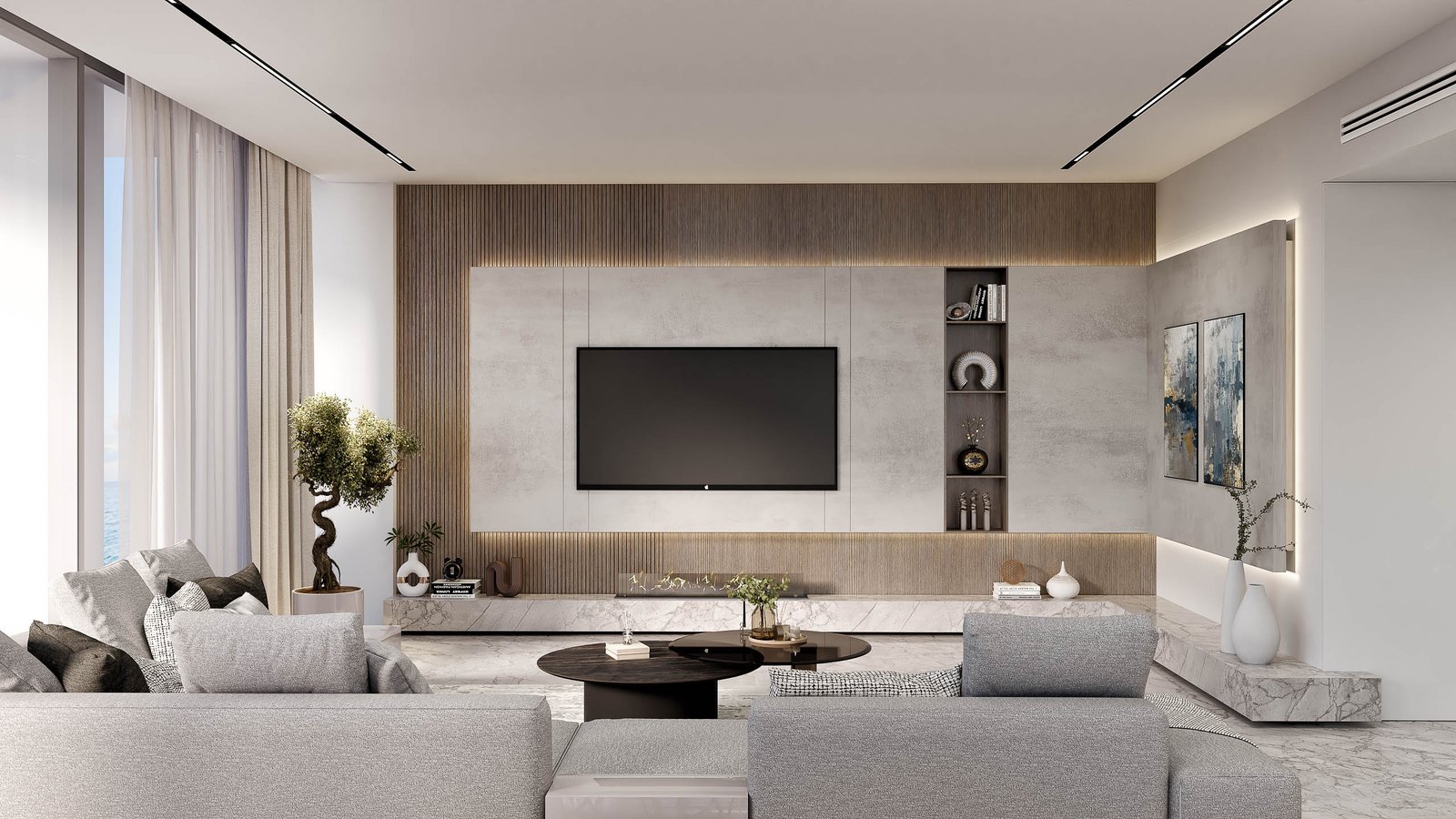 The entrance leads to the living space, enriched with views of the sea and the vicinity, thanks to the floor-to-ceiling windows. The living space leads out onto a L-shaped balcony with a Jacuzzi overlooking the sea.