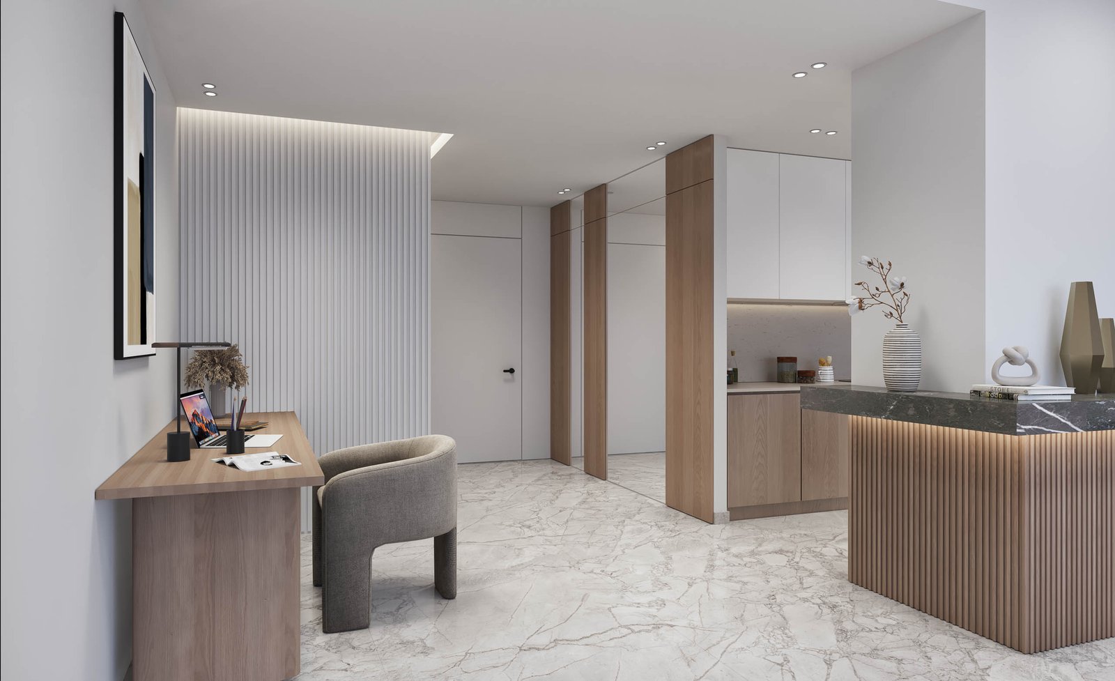 Nearly half of the living space is for the seating area. Adjacent to it is a dining area large enough to accommodate an eight or ten seat dining table. The kitchen comprises an outer show-kitchen and an inner, enclosed wet-kitchen.